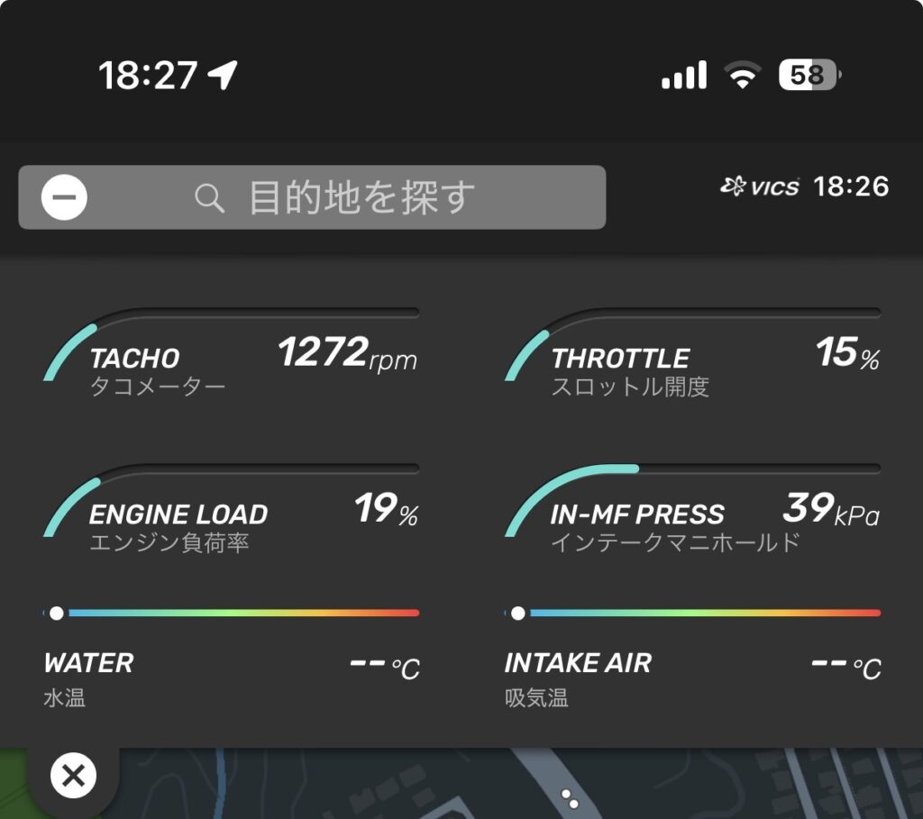 - 実際のカーナビタイムの画面上でのOBD2情報表示も問題ありませんでした。(ホンダ車は元々非対応項目がありますがこれはホンダ車ではどのアダプタでもそうです)